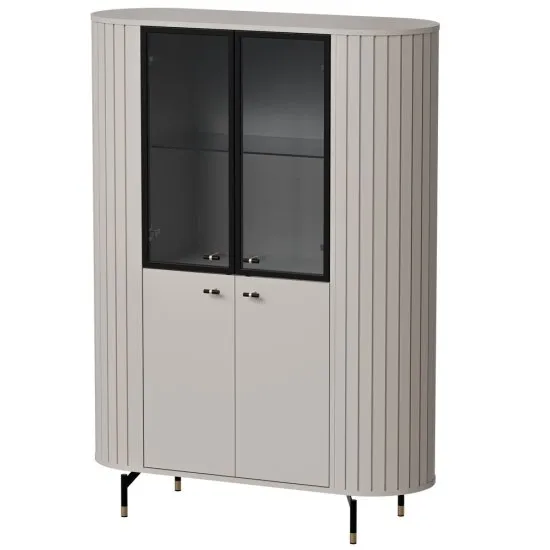Lubisz niestandardowe wnętrza i dodatki? Kupując kolekcję Zante zapewnisz nowoczesny design i zaskoczysz wszystkich gości! Witryna czterodrzwiowa Zante została wykonana z płyty laminowanej w eleganckim kolorze, co nadaje jej nowoczesny i stylowy wygląd. Posiada połokrągłe boki z lameli, co podkreśla subtelny i łagodny charakter mebla. Komoda wyposażona jest w dwa zamykane schowki z drzwiami oraz dwa ze szklanym frontem. Taki układ pozwala na swobodne schowanie wszystkich Twoich rzeczy. Uchwyty oraz nożki wykonane są ze stali, co zapewnia trwałość i stabilność. Detale w kolorze czarnym z subtelnymi, złotymi akcentami dodają elegancji i nowoczesnego stylu. Całość idealnie nadaje się do salonu, sypialni czy jadalni, zapewniając nie tylko praktyczne miejsce do przechowywania, ale także stylowy element dekoracyjny. Szczegoły produktu: korpus oraz fronty wykonane z wiorowej płyty laminowanej 16 mm w kolorze Kaszmirowy Beż PU1506 SO, odpornej na wilgoć i zarysowania, nogi oraz uchwyty