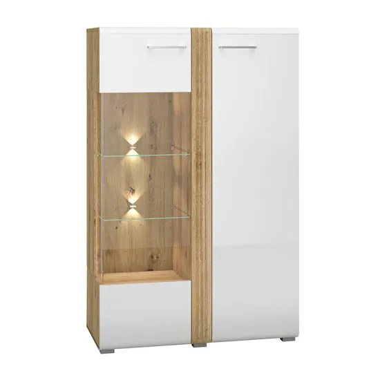 Poszukujesz nowoczesnych mebli z nutą elegancji? Kolekcja mebli Fandri przez połączenie matowego korpusu z białymi, połyskliwymi frontami ożywi Twoje wnętrze i nada mu stylowego wyglądu! Witryna Fandri to elegancki mebel, ktory świetnie sprawdzi się jako ozdoba salonu lub jadalni. Przeszklona część pozwoli na wyeksponowanie stylowych ozdob lub eleganckiej zastawy. Dodatkowo w meblu znajduje się aż 6 zamykanych schowkow, dzięki ktorym ukryjesz mniej atrakcyjne przedmioty. Atutem mebla jest dekoracyjna listwa z frezowaniem w formie pionowych linii, ktore dodają całości designu i szyku umieszczona na froncie mebla. Szczegoły produktu: korpus wykonany z płyty laminowanej odpornej na wilgoć i zarysowania, krawędzie zabezpieczone obrzeżem ABS, ktore chroni przed uszkodzeniami mechanicznymi, część szklana wykonana z wysokiej jakości, certyfikowanego szkła hartowanego zwiększającego bezpieczeństwo użytkowania znajduje się po lewej stronie mebla, drzwi posiadające funkcję tzw. "cichego domyku”,