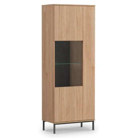 Chcesz, by w Twoim wnętrzu zapanował nowoczesny a jednocześnie elegancki wygląd? Kolekcja Perila idealnie połączy oba te style! Witryna Perila to idealny mebel do salonu. Ma prosty i elegancki kształt, a jednocześnie jest bardzo pakowna. Posiada siedem zamkniętych połek: dwie duże oraz pięć mniejszych - ukryją one wszystkie niezbędne przedmioty, takie jak drobny sprzęt, dokumenty lub części garderoby. Oprocz tego witryna ma dwie przeszklone połki, pozwalające wyeksponować elegancką zastawę lub unikatowe pamiątki. Dodatkowo, mebel ma opcję dobrania oświetlenia LED, ktore jeszcze bardziej podkreśli to, co chcesz zaprezentować. Szczegoły produktu: maksymalne obciążenie połek małych oraz szklanych: 3 kg, natomiast dużych połek 5 kg, drzwi otwierane metodą "push to open” i posiadające tzw. "cichy domyk”, metalowe nożki, posiadające ślizgi, ktore zapobiegają rysowaniu podłoża, korpus i fronty mebla wykonane z płyty wiorowej o grubości 16 mm (K086 Natural Rockford Hickory, Kronospan),