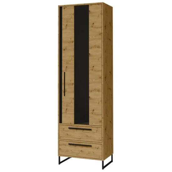 Posiadasz niewielkie mieszkanie i szukasz mebli, ktore pozwolą Ci zaaranżować salon i przestrzeń biurową w jednym pomieszczeniu? Z kolekcją Abirly z pewnością Ci się to uda! Witryna jednodrzwiowa Abirly będzie stanowić doskonałe miejsce do przechowywania rożnego rodzaju przedmiotow - od rodzinnych pamiątek, po zastawę stołową. Mebel charakteryzuje się prostą bryłą, wzbogaconą czarną szklaną wstawką, ktora nadaje całości wyjątkowego charakteru. Podstawę stanowi metalowy stelaż, ktory zapewnia stabilność i trwałość konstrukcji, a także nadaje wizualnej lekkości. Atutem są rownież dwie szuflady - idealne na drobiazgi, na ktore zwykle brakuje miejsca w pomieszczeniu. Szczegoły: wykonanie blatu: płyta laminowana 16 mm, wykonanie podstawy: metal, wykonanie uchwytow: tworzywo sztuczne, rodzaj drzwi: uchylne, rodzaj prowadnic: kulkowe, szkło niehartowane ciemne, grubość 4 mm, kolor: dąb artisan/czarny.