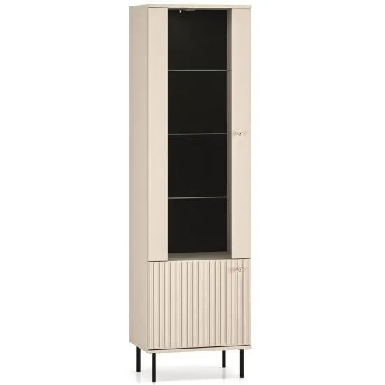 Cenisz sobie połączenie wysokiej jakości materiałow z nowoczesnym designem i funkcjonalnością? Dzięki kolekcji Caletto Twoje wnętrza wyrożnią się niepowtarzalnym klimatem, a rzeczy zyskają sporo miejsca do przechowywania! Witryna jednodrzwiowa Caletto to gustowny mebel w kolorze beżowym, ktory doskonale pasuje do rożnorodnych aranżacji. Złote uchwyty dodają subtelnej i luksusowej nuty do całej kompozycji, a umieszczenie na czarnych metalowych nożkach podkreśla jej nowoczesny charakter oraz pozwala w łatwy sposob utrzymać czystość podłogi. Wykonanie z najwyższej jakości płyty laminowanej pozwala zachować trwałość i łatwość w utrzymaniu w doskonałym stanie przez wiele lat. Obrzeża ABS zapewniają dodatkową ochronę przed uszkodzeniami mechanicznymi. Kolejną zaletą tego produktu jest funkcja cichego domyku. Ponadto witryna posiada certyfikowane szkło hartowane, a trzy szklane połki umożliwiają eleganckie wyeksponowanie pamiątek i cennych przedmiotow. Podświetlenie w standardzie nadaje