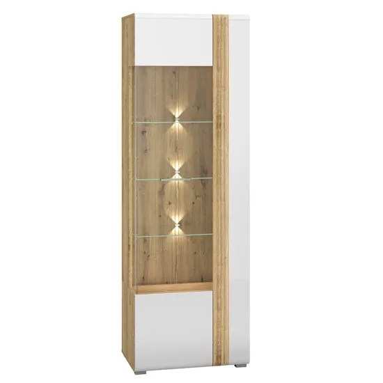 Poszukujesz nowoczesnych mebli z nutą elegancji? Kolekcja mebli Fandri przez połączenie matowego korpusu z białymi, połyskliwymi frontami ożywi Twoje wnętrze i nada mu stylowego wyglądu! Witryna wysoka Fandri to elegancki mebel, ktory świetnie sprawdzi się jako ozdoba salonu lub jadalni. Przeszklona część pozwoli na wyeksponowanie stylowych ozdob lub eleganckiej zastawy. Dodatkowo w meblu znajdują się zamykane schowki, dzięki ktorym ukryjesz mniej atrakcyjne przedmioty. Atutem mebla jest dekoracyjna listwa z frezowaniem w formie pionowych linii, ktore dodają całości designu i szyku umieszczona na froncie mebla. Szczegoły produktu: korpus wykonany z płyty laminowanej odpornej na wilgoć i zarysowania, krawędzie zabezpieczone obrzeżem ABS, ktore chroni przed uszkodzeniami mechanicznymi, część szklana wykonana z wysokiej jakości, certyfikowanego szkła hartowanego zwiększającego bezpieczeństwo użytkowania, drzwi posiadające funkcję tzw. "cichego domyku” otwierane na lewą stronę, fronty
