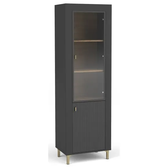 Szukasz idealnej witryny do swojego wnętrza, ktora pięknie wyeksponuje wybrane dekoracje, ale także zapewni praktyczne rozwiązanie do przechowywania? Wysoka witryna Lammila o wyjątkowym designie będzie świetnie komponowała się z nowoczesnymi wnętrzami. Kolor czarny nadaje jej eleganckiego uroku, ktory doskonale komponuje się z rożnymi aranżacjami wnętrz. Natomiast połki w kolorze dębu whisky dodają mu ciepła, tworząc harmonijną kombinację kolorystyczną. Z kolei wyrafinowany detal w postaci pionowych listew na frontach dodaje wyjątkowego wyglądu całości. Mebel posiada witrynę z trzema połkami, dzięki ktorym wyeksponujesz wybrane dekoracje oraz dwie zamknięte połki, ktore pozwolą na schowanie przedmiotow w swobodny sposob. Dzięki złotym uchwytom oraz nożkom, całość prezentuje się lekko i bardzo stylowo. Kolekcja Lammila - wybierz doskonałość dla swojego wnętrza już dziś! Szczegoły produktu: konstrukcja wykonana z płyty wiorowej laminowanej Czarny Onyx PU1001 MT, wykonanie blatu oraz