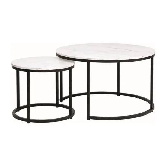 Zestaw dwoch stolikow kawowych Dion to niezwykła kombinacja elegancji i nowoczesnego designu, ktora przykuje uwagę i nadaje wnętrzu wyjątkowego charakteru. Zestaw składa się z dwoch stolikow, rożnej wielkości, ktore, idealnie sprawdzą się, gdy potrzebujesz więcej miejsca na przekąski, kawę lub piękną dekorację. Gładkie blaty, inspirowane białym marmurem, wykonane z płyty MDF i pokryte laminatem, wprowadzają do przestrzeni subtelny luksus. Blaty osadzono na ciekawym, geometrycznym stelażu w kolorze czarnym. Wyrazista podstawa nadaje całej kompozycji charakteru i gracji. Model Dion to propozycja dla tych, ktorzy poszukują nietuzinkowego elementu do swojego wnętrza. Szczegoły produktu: blaty wykonane z wytrzymałej płyty MDF, pokrytej laminatem metalowy stelaż w kolorze czarnym, średnica blatow: 80 i 60 cm, wymiary stolika 1: 80x80x48 cm, wymiary stolika 2: 48x48x42 cm, kolorystyka blatow: biały marmur.