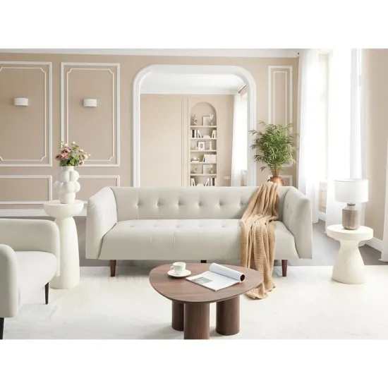 Ta elegancka sofa to ponadczasowy klasyk, ktory doskonale komponuje się zarowno z tradycyjnymi, jak i nowoczesnymi wnętrzami. Jej siedzisko, podłokietniki oraz oparcie są tapicerowane wysokiej jakości tkaniną, przyjemną w dotyku i trwałą. Klasyczne pikowanie dodaje jej elegancji w stylu vintage, a miękkie wypełnienie zapewnia wyjątkowy komfort. Całość uzupełniają smukłe, ciemne drewniane nożki, ktore nadają sofie subtelny, minimalistyczny charakter.głębokość 78 cmKolor JasnobeżowyLiczba miejsc 3Materiał drewno tkaninaMateriał nog DrewnoModel BYSKESzerokość 200 cmWysokość 73 cm