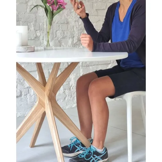 Jubi Bold okrągły stoł jadalniany o średnicy 100 cm świetnie sprawdzi się dla 5, a nawet 6 osob. Podstawa wykonana z drewna jesionowego. Blat z laminowanej i lakierowanej płyty MDF dostępnej w wielu kolorach.