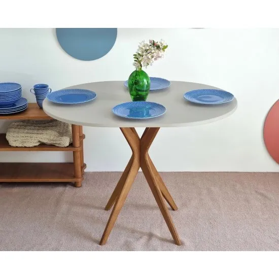 Owalny stoł Jubi to świetne rozwiązanie dla 2 bądź 4 osob. Podstawa wykonana z drewna jesionowego. Blat z laminowanej i lakierowanej płyty MDF dostępnej w wielu kolorach.