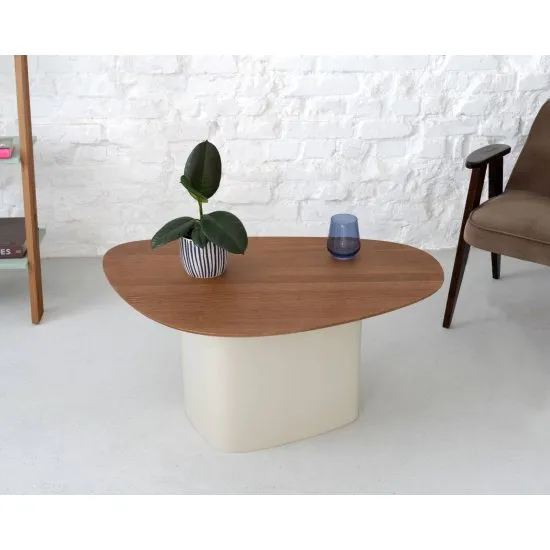 Stolik kawowy Mini Cells o opływowym kształcie. Dostępne wybarwienia blatu: naturalny jesion, dąb, orzech, czarny, biały.