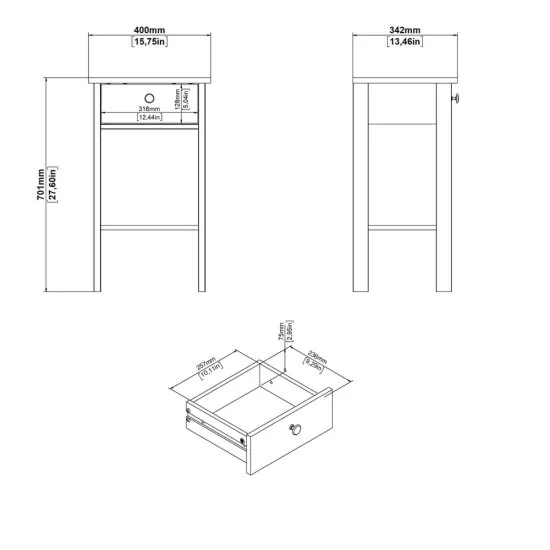Madrid została wyposażona w jedną pojemną szufladę, w ktorej można przechowywać drobne akcesoria, takie jak ładowarki, okulary czy notesy. Dolna połka to dodatkowa przestrzeń idealna na książki, dekoracje lub koszyk z podręcznymi drobiazgami. Zestaw dwoch uchwytow (skorzana pętelka i klasyczne pokrętło) umożliwia personalizację wyglądu szafki zgodnie z preferencjami.