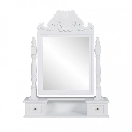 Pięknie wykończona toaletka zawiera bogactwo wypracowanych detali. Kunszt wykonania nadaje jej klasyczny, elegancki wygląd.Prostokątne, stylowe lustro zajmuje centralne miejsce. Można je ustawić pod rożnymi kątami. Podstawa zawiera dwie małe szufladki, ktore mogą pomieścić Twoje drobiazgi. Toaletka ta jest wykonana z wysokiej jakości MDF. Można ją ustawić na stole, aby utworzyć pełnowymiarową toaletkę. Przesyłka obejmuje toaletkę z dwiema szufladami i lustrem.Uwaga: ponieważ mebel ten jest wykonany ręcznie z drewna i pomalowany na biało, może on wykazywać pewne niedoskonałości. Wymiary: 50 x 12,5 x 74 cm (dł. x szer. x wys.) Kolor: biały Materiał: drewno (MDF) Długość 50 cmKolor BiałyLiczba Szuflad 2Materiał MDF drewnoSzerokość 12,5 cmWaga 5 kgWysokość 74 cm