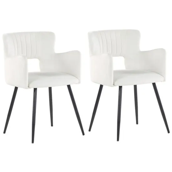 Krzesła do Jadalni Sanilac - Komfort i Elegancja w Welurze Nowoczesny Design z Nutą RetroOdkryj zestaw dwoch eleganckich krzeseł Sanilac, ktore doskonale łączą w sobie nowoczesny design z subtelnymi akcentami retro. Ich prosta forma i przemyślana konstrukcja sprawiają, że idealnie wpisują się w rożnorodne aranżacje wnętrz. Wyściełane siedzisko z podłokietnikami i charakterystycznym wycięciem w oparciu zapewnia wyjątkowy komfort siedzenia, a gładka welurowa tapicerka nadaje krzesłom luksusowego wyglądu. Luksusowy welur i solidna konstrukcjaPrezentowany zestaw krzeseł charakteryzuje się wysoką jakością wykonania i dbałością o detale. Mieniące się włokna welurowej tapicerki nadają głębi koloru, wspołgrając z malowanymi proszkowo, pochylonymi nożkami, ktore zapewniają stabilność i wytrzymałość. Subtelne przeszycia na przedniej części oparcia dodają krzesłom unikalnego wdzięku, podkreślając ich estetykę. Idealne do odświeżenia wyglądu jadalni lub biura. Krzesła o wymiarach: Wysokość: 75 cm, Szerokość: 52 cm, Głębokość: 44 cm, z obiciem z miękkiego weluru, są nie tylko piękne, ale i praktyczne. Każde krzesło może wytrzymać obciążenie do 120 kg. Uniwersalność i Wszechstronność UżytkowaniaKrzesła Sanilac to meble o niezwykłej uniwersalności. Ich elegancki i zarazem funkcjonalny design sprawia, że doskonale odnajdą się w wielu pomieszczeniach – od jadalni, przez salon, aż po gabinet czy sypialnię. Świetnie sprawdzą się zarowno jako uzupełnienie stołu jadalnianego, jak i stylowe siedzisko przy biurku lub toaletce.Dodaj ten wyjątkowy zestaw do swojego wnętrza i ciesz się komfortem oraz niezrownanym stylem! głębokość 44 cmKolor BiałyMaksymalne obciążenie 120 kgMateriał WelurSzerokość 52 cmWysokość 75 cm