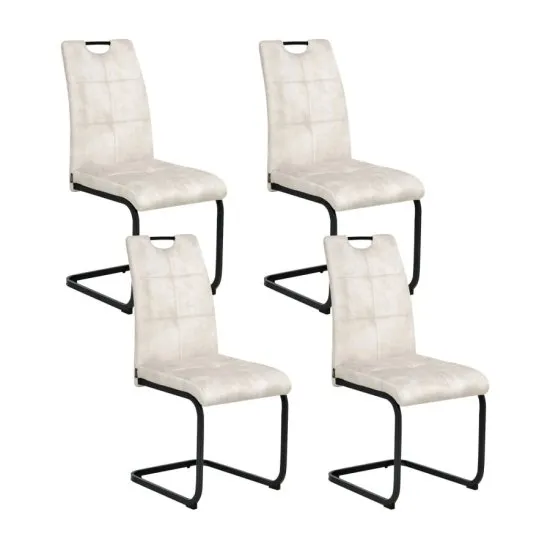 Odśwież wygląd swojej jadalni, kuchni lub salonu dzięki temu zestawowi stylowych krzeseł. Eleganckie, wysokiej jakości obicie oraz stabilne metalowe nogi sprawiają, że to niezbędnik do wyposażenia wnętrz w stylu nowoczesnym lub minimalistycznym. Praktyczny uchwyt w oparciu ułatwia przenoszenie, a ochronne nakładki zapewniają bezpieczeństwo użytkowania na rożnych powierzchniach.głębokość 50 cmKolor JasnobeżowyLiczba krzeseł 4Materiał metal tkaninaMateriał nog MetalModel CISCONakładki Ochronne TakSzerokość 43 cmUchwyt w oparciu TakWysokość 98 cm