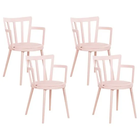 Zestaw 4 krzeseł do jadalni.Nowoczesny w formie zestaw krzeseł o pastelowo rożowej barwie będzie niezwykle stylowym dodatkiem do Twojej jadalni! Gładka, jednolita powierzchnia materiału, obijającego siedzisko i oparcie, nadaje krzesłu elegancji, a jego konstrukcja zapewnia ergonomiczny kształt. Smukłe nogi, wyprodukowane z mocnego drewna kauczukowego, sprawiają, że mebel jest stabilny, dodając przy tym lekkości całemu projektowi. Cechy produktu:Krzesła do jadalni posiadają nowoczesny wyglądMają ergonomiczny kształt i stabilne nogiSiedziska są wygodne i mają solidne oparciaUtrzymane są w pastelowo rożowej barwieWysokość krzesła: 77 cm głębokość 52 cmKolor Pastelowy rożLiczba krzeseł 4Materiał drewno kauczukowe Materiał syntetycznyMateriał nog drewno kauczukoweStyl nowoczesnySzerokość 45 cmWysokość 77 cm