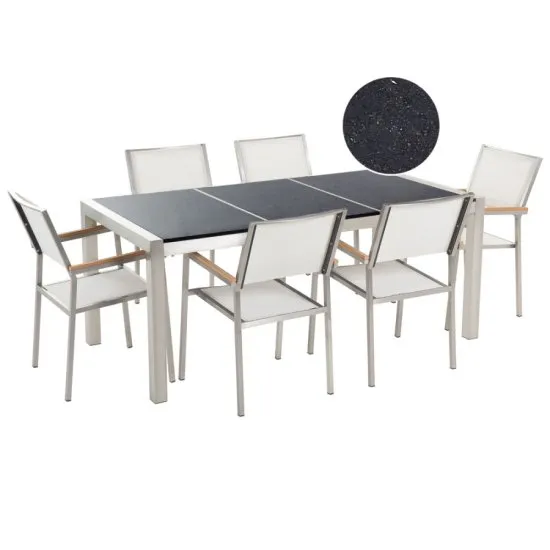 Zestaw jadalniany dla 6 osob Na zdjęciu znajduje się elegancki zestaw jadalniany przeznaczony dla sześciu osob.W skład zestawu wchodzi duży stoł z białym, kamiennym blatem o prostokątnym kształcie oraz osiem krzeseł tapicerowanych delikatnym, szarym materiałem. Stoł posiada solidne nogi, ktore zapewniają stabilność. Krzesła mają zaokrąglone oparcia i miękkie siedziska, zapewniając komfort podczas siedzenia. Całość utrzymana jest w nowoczesnym stylu, co sprawia, że zestaw doskonale wpasuje się w rożnorodne aranżacje Na zdjęciu znajduje się zestaw jadalniany składający się z białych naczyń z delikatnym wzorem przypominającym kamień. Komplet przeznaczony jest dla sześciu osob i składa się z talerzy obiadowych, talerzy deserowych oraz misek. Naczynia prezentują elegancki i nowoczesny design, ktory idealnie wpasuje się w rożnorodne aranżacje stołu, dodając mu stylistycznej harmonii i subtelnego uroku. Zestaw jadalniany dla 6 osob GrossetoPoszukujesz eleganckiego i praktycznego zestawu jadalnianego dla swojej rodziny? Grosseto to zestaw stworzony z myślą o komforcie i stylowym wyglądzie, ktory doskonale wpasuje się w nowoczesne wnętrza. Zestaw składa się z: 6 krzesełstoł o wymiarach 160x90 cmWysokiej jakości materiały - Stoł posiada blat wykonany z hartowanego, lakierowanego szkła, ktory imituje surowy kamień w naturalnych, białych barwach. Solidne nogi stołu oraz krzeseł wykonane są z wytrzymałego metalu, co zapewnia stabilność i trwałość całej konstrukcji. Stylowy design - Grosseto to zestaw utrzymany w nowoczesnym stylu, ktory doskonale komponuje się z rożnymi aranżacjami wnętrz. Blat stołu imitujący surowy kamień dodaje elegancji, a metalowe nogi nadają industrialnego charakteru. Komfort użytkowania - Krzesła obite są miękką tkaniną w kolorze szarym, co zapewnia wygodę podczas siedzenia. Wyprofilowane oparcia i dodatkowe wyściełanie sprawiają, że korzystanie z zestawu jest niezwykle komfortowe. Zestaw jadalniany dla 6 osob w komplecieGrosseto to zestaw jadalniany, ktory łączy w sobie elegancję, wygodę i trwałość. Dzięki niemu każde wspolne spożywanie posiłkow stanie się wyjątkowym doświadczeniem, a wnętrze nabierze stylowego charakteru. Duży stoł i sześć krzeseł to idealny zestaw do jadalni i salonu, ktory z pewnością spełni oczekiwania całej rodziny. Idealne dopasowanie do wnętrz - Dzięki swojemu eleganckiemu i nowoczesnemu wyglądowi, zestaw jadalniany Grosseto doskonale wpasuje się zarowno w klasyczne, jak i nowoczesne wnętrza. Jego neutralna kolorystyka ułatwia dopasowanie do rożnych stylow aranżacji. Praktyczność i wygoda - Duży stoł o wymiarach 160 x 90 cm zapewnia wystarczającą ilość miejsca dla sześciu osob, co czyni zestaw idealnym wyborem dla rodzin oraz do przyjmowania gości... Długość 160 cmKolor BiałyKształt stołu prostokątnyLiczba krzeseł 6Liczba osob 6Materiał granit tkanina stal nierdzewna szkło hartowaneMateriał Blatu Szkło hartowaneMateriał nog stal nierdzewnaMateriał obicia tkaninaModel GrossetoStyl nowoczesnySzerokość 90 cm
