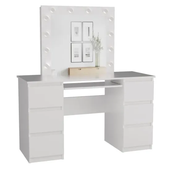 Biała Toaletka KUBA z Lustrem MARINA - Elegancja i Funkcjonalność Odkryj Wyjątkowe Połączenie Stylu i PraktycznościPrezentujemy Zestaw Toaletka KUBA + LUSTRO MARINA w eleganckim białym kolorze, ktory idealnie wkomponuje się w każdą sypialnię czy garderobę. Ta wszechstronna toaletka to nie tylko miejsce do makijażu, ale także funkcjonalne biurko, oferujące komfort i wydajność w codziennym użytkowaniu. Wyposażona w oświetlenie LED i pojemne szuflady, spełnia oczekiwania nawet najbardziej wymagających użytkownikow. Przemyślana Konstrukcja i SpecyfikacjaToaletka KUBA została zaprojektowana z myślą o maksymalnej wygodzie. Wykonana z płyty wiorowej laminowanej o grubości 16 mm, gwarantuje trwałość i łatwość w utrzymaniu czystości. Bezuchwytowe fronty szuflad nadają jej modernistyczny wygląd, a łącznie 6 pojemnych szuflad (po 3 z każdej strony) zapewnia dużo miejsca do przechowywania kosmetykow i akcesoriow. Lustro MARINA z energooszczędnym oświetleniem LED, aktywowanym włącznikiem, tworzy idealne warunki do perfekcyjnego makijażu.Materiał: Płyta wiorowa laminowana 16 mmWysokość: 76 cmSzerokość: 130 cmGłębokość: 51 cmLiczba paczek: 3 Nowoczesne Rozwiązania dla Twojego KomfortuDzięki prowadnicom rolkowym szuflady otwierają się płynnie i cicho, zapewniając bezpieczne użytkowanie. Zestaw toaletka KUBA + LUSTRO MARINA Biały to produkt polskiego producenta, co jest gwarancją wysokiej jakości wykonania i dbałości o detale. Ten elegancki mebel doskonale sprawdzi się jako centralny punkt Twojej strefy piękna lub jako praktyczne miejsce do pracy i nauki. Łatwy montaż dzięki dołączonej instrukcji sprawi, że toaletka szybko znajdzie swoje miejsce w Twoim domu.Odkryj pełnię możliwości i dodaj ten produkt do koszyka już dziś! Fronty szuflad Bezuchwytowegłębokość 51 cmGrubość płyty 16 mmKolor BiałyLiczba paczek 3Liczba Szuflad 6Materiał Płyta wiorowa laminowanaOświetlenie LEDProwadnice szuflad rolkoweSzerokość 130 cmWaga 61,5 kgWysokość 76 cm